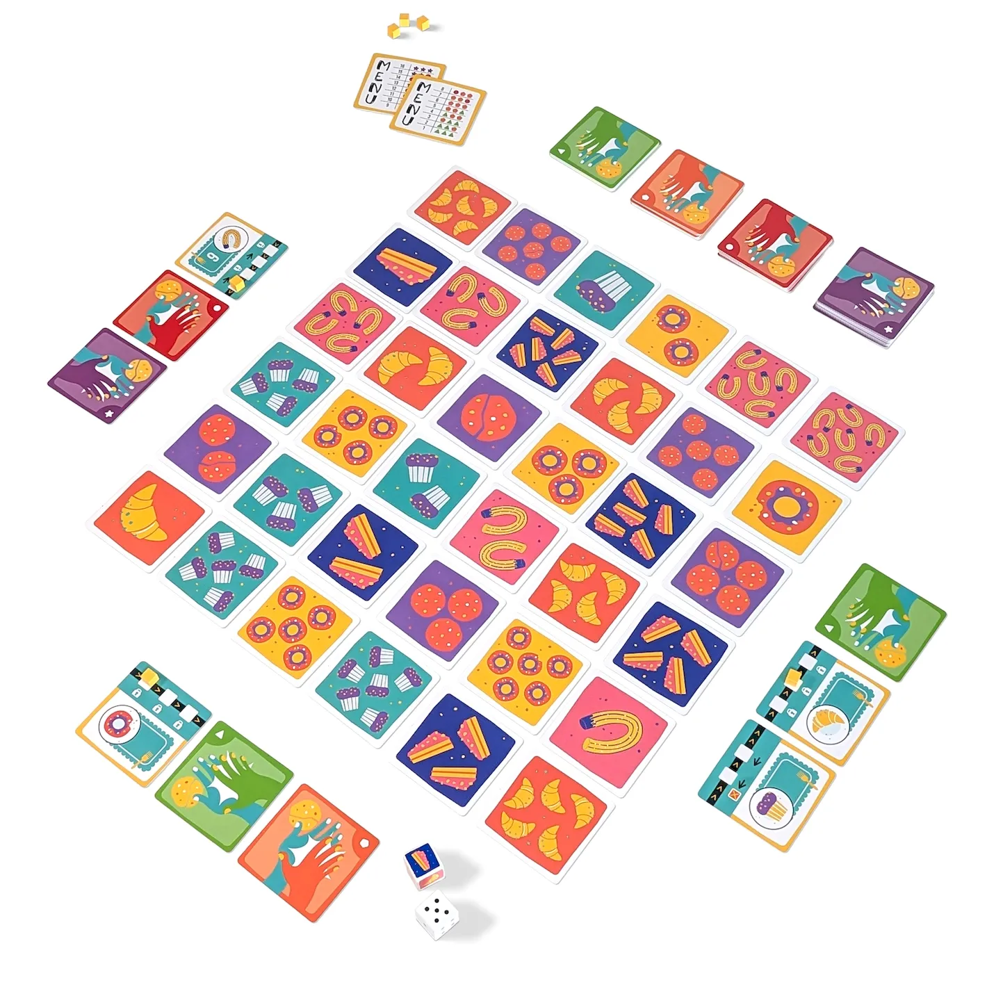 | Contenu | 6 cubes en bois, 36 cartes Gourmandise, 72 cartes Contrainte, 1 dé de 6, 1 dé Gourmandise 2 cartes ménu, 1 règle du jeu |