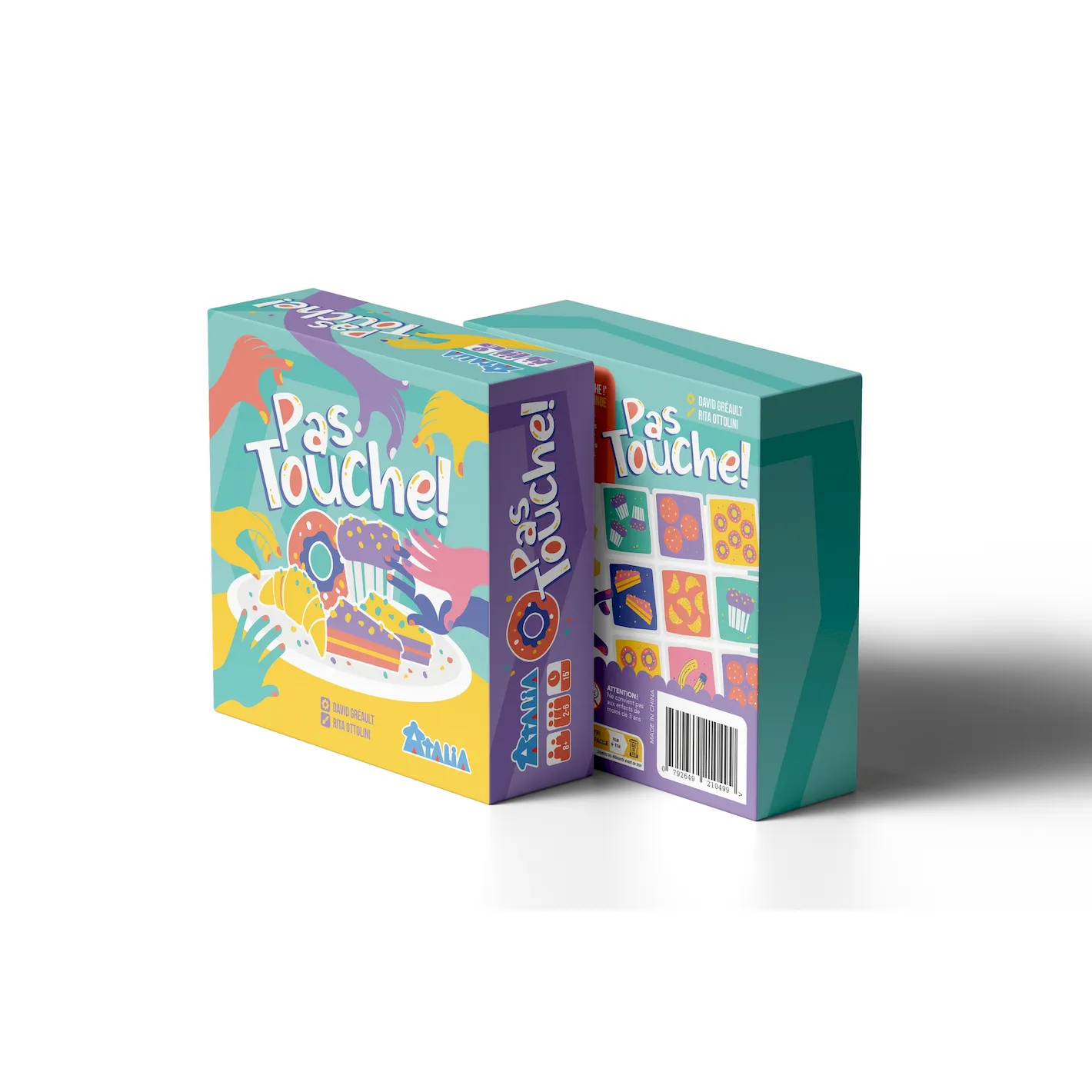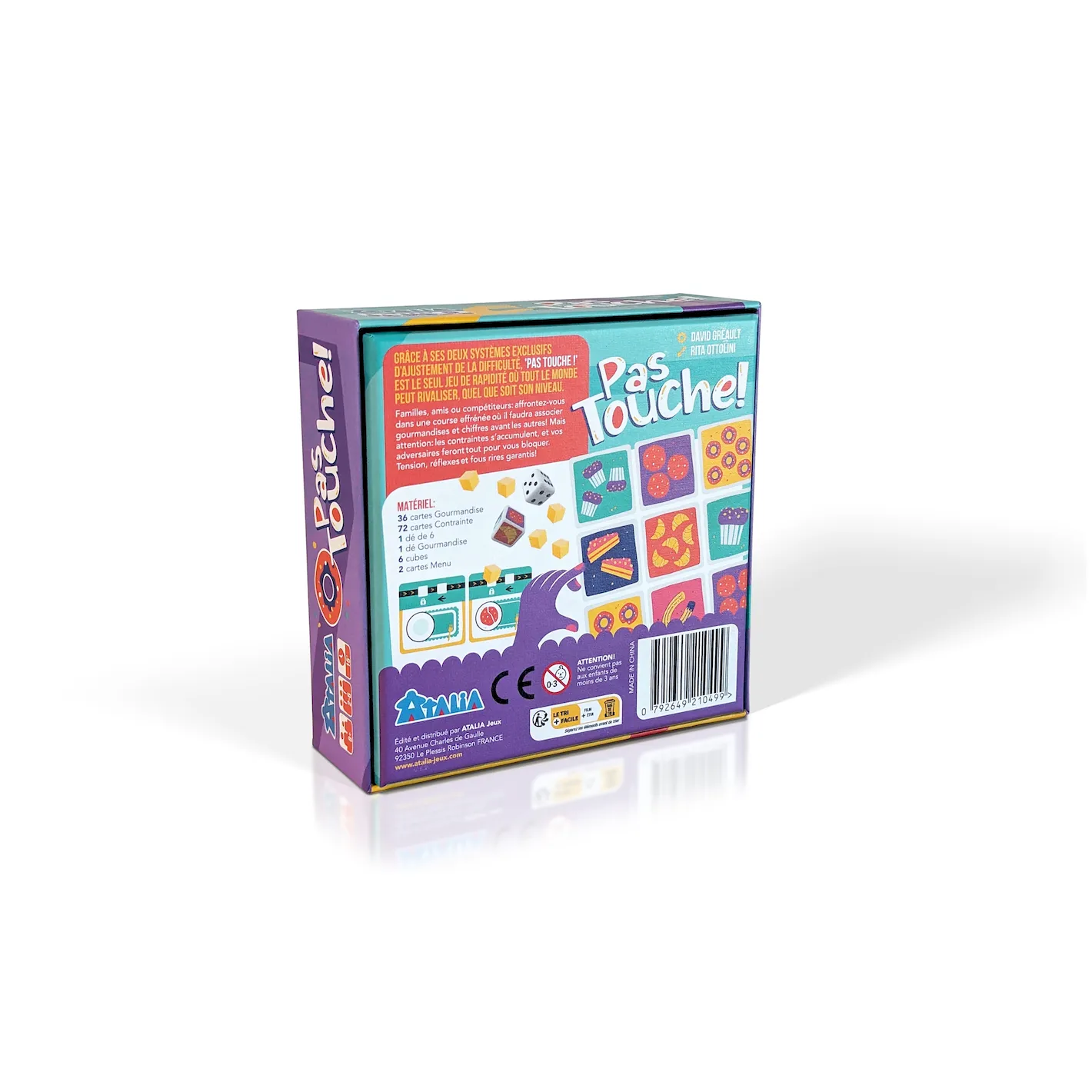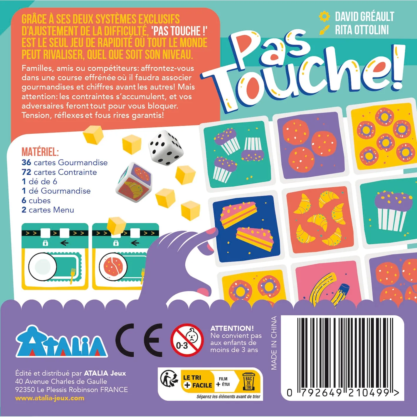 Pas Touche ! est un jeu de rapidité et de discrimination visuelle où les joueurs doivent identifier et toucher la carte correspondant à la combinaison obtenue en lançant deux dés : un dé chiffre et un dé gourmandise. Plus la partie avance, plus les joueurs accumulent des contraintes qui compliquent leur progression en équilibrant le jeu.