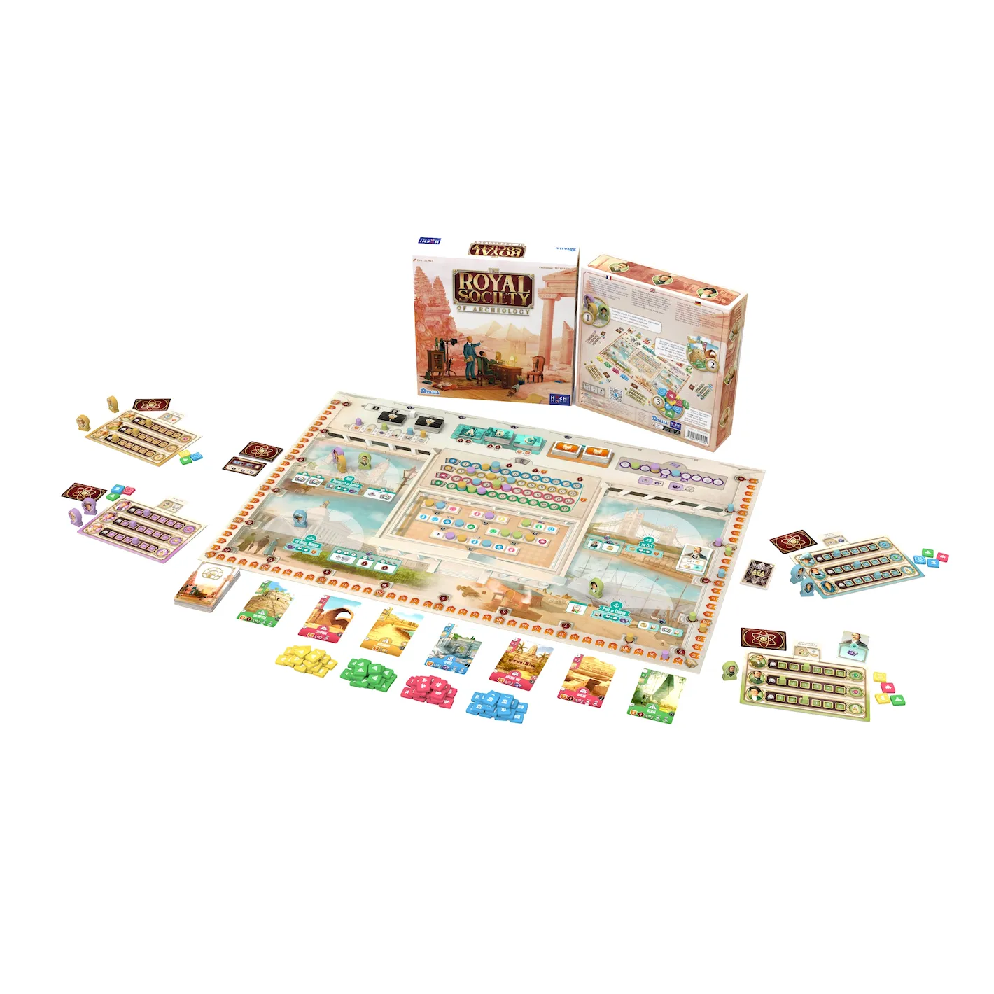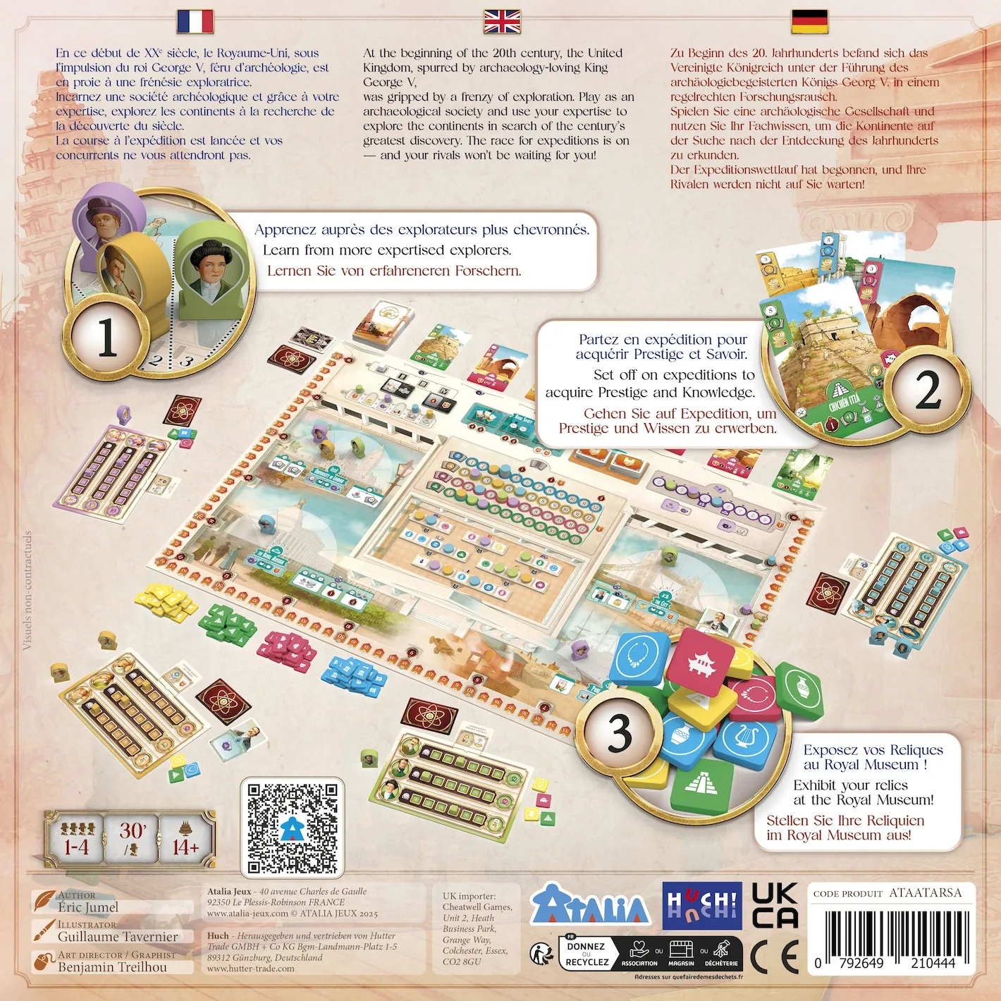 Dans The Royal Society of Archeology, chaque joueur incarne le directeur d’une prestigieuse société archéologique au début du XXe siècle, avec pour objectif de développer sa réputation internationale tout en contribuant à l’avancement du savoir scientifique. Sur plusieurs années de jeu, vous organisez des expéditions lointaines, financez des recherches, étudiez des civilisations anciennes et exposez vos trouvailles pour gagner en prestige et en savoir. Les décisions que vous prenez à Londres ou sur le terrain influencent vos ressources et votre progression, et seule une stratégie équilibrée entre prestige et savoir vous mènera vers la victoire en fin de partie.