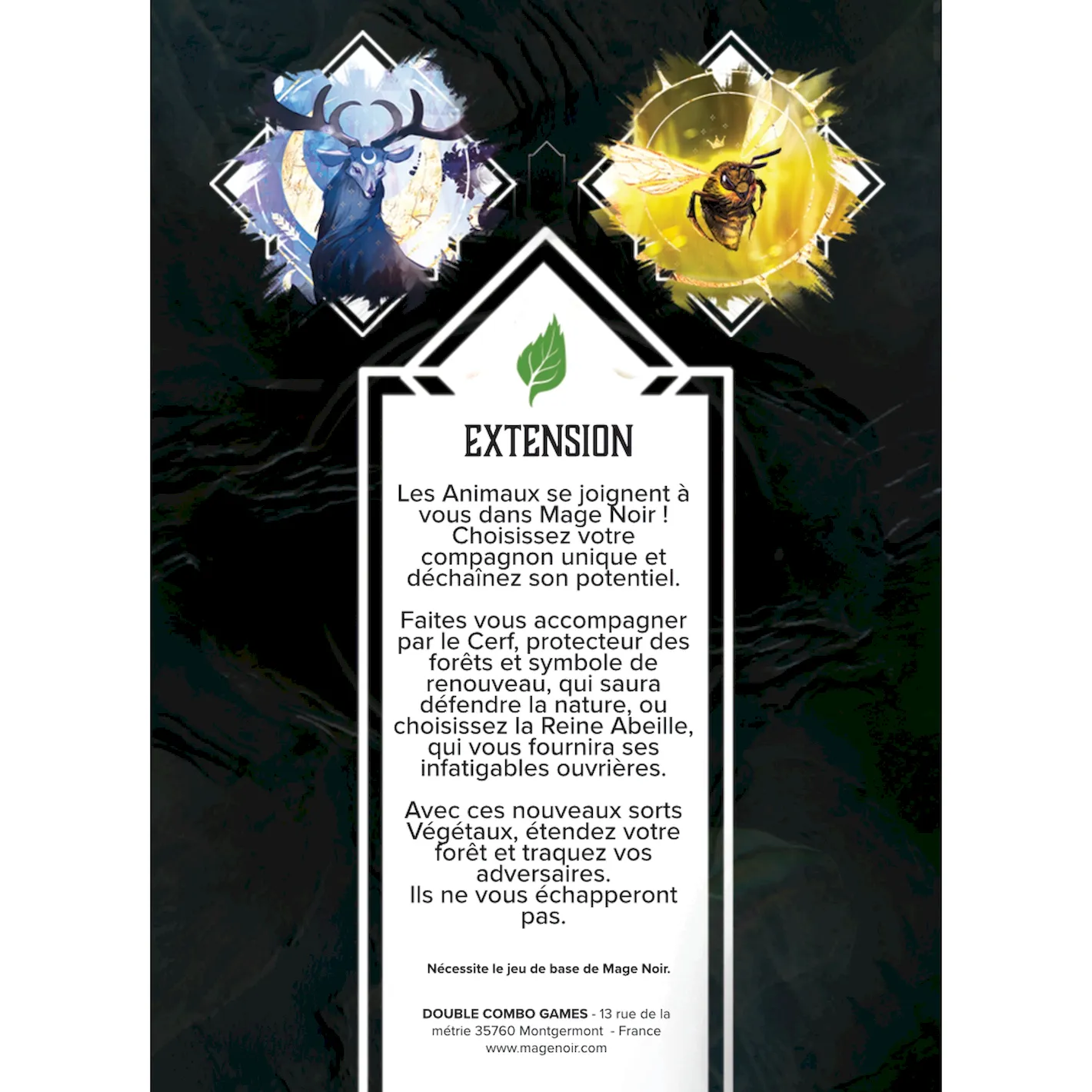 Grâce à cette extension, les Animaux se joignent à vous dans Mage Noir ! Choisissez votre compagnon unique et déchaînez son potentiel. Faites vous accompagner par le Cerf, protecteur des forêts et symbole de renouveau, qui saura défendre la nature, ou choisissez la Reine Abeille, qui vous fournira ses infatigables ouvrières. Avec ces nouveaux sorts Végétaux, étendez votre forêt et traquez vos adversaires. Ils ne vous échapperont pas.