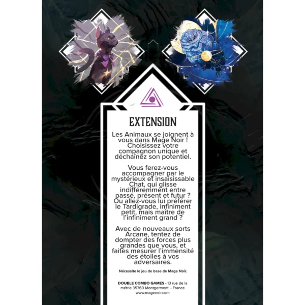 Grâce à cette extension, les Animaux se joignent à vous dans Mage Noir ! Choisissez votre compagnon unique et déchaînez son potentiel. Vous ferez-vous accompagner par le mystérieux et insaisissable Chat, qui glisse indifféremment entre passé, présent, et futur ? Ou allez vous lui préférer le Tardigrade, infiniment petit, mais maître de l’infiniment grand ? Avec de nouveaux sorts Arcane, tentez de dompter des forces plus grandes que vous, et faites mesurer l’immensité des étoiles à vos adversaires.